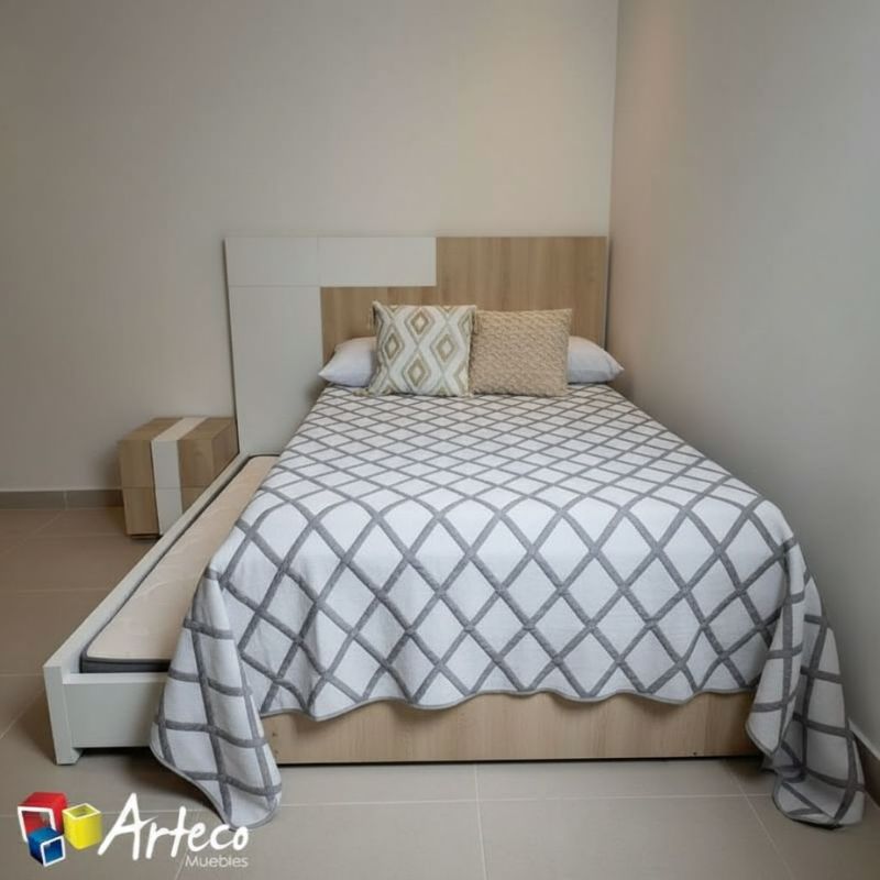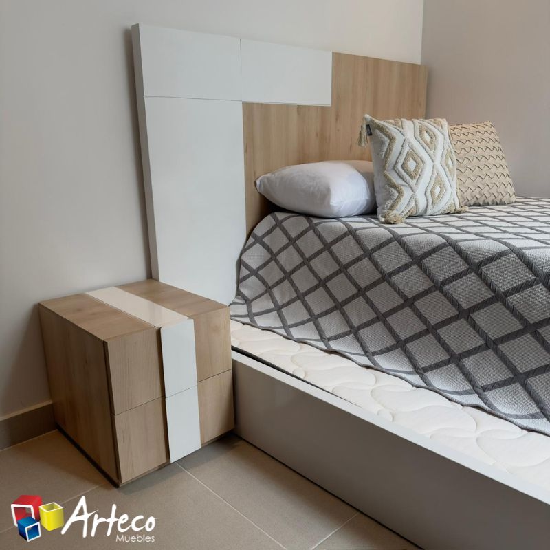 Incluye un nido auxiliar práctico, ideal para optimizar espacios, y una mesa de noche fabricada con los mismos materiales, logrando una composición armónica y contemporánea. Perfecta para quienes buscan un dormitorio versátil, moderno y con un aire relajante.