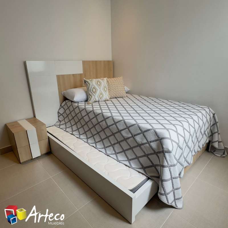 Alcoba Juvenil Natura combina diseño moderno y funcionalidad en un ambiente juvenil lleno de estilo. Elaborada en madera seca e inmunizada, garantiza durabilidad y resistencia. Su acabado en poliuretano de alto brillo resalta el contraste del diseño en el espaldar, donde la calidez de la madera se fusiona con la elegancia del tono gris.